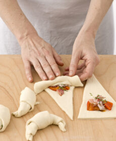 Per preparare i cornetti croccanti, stendete la pasta da pane e tagliatela in triangoli. Sistemate alla base pezzetti di peperone agrodolce, cubetti di pancetta o speck ed erbe aromatiche e arrotolate. Arcuate le punte dei cornetti. Salate la superficie e infornate per 15-20 minuti.