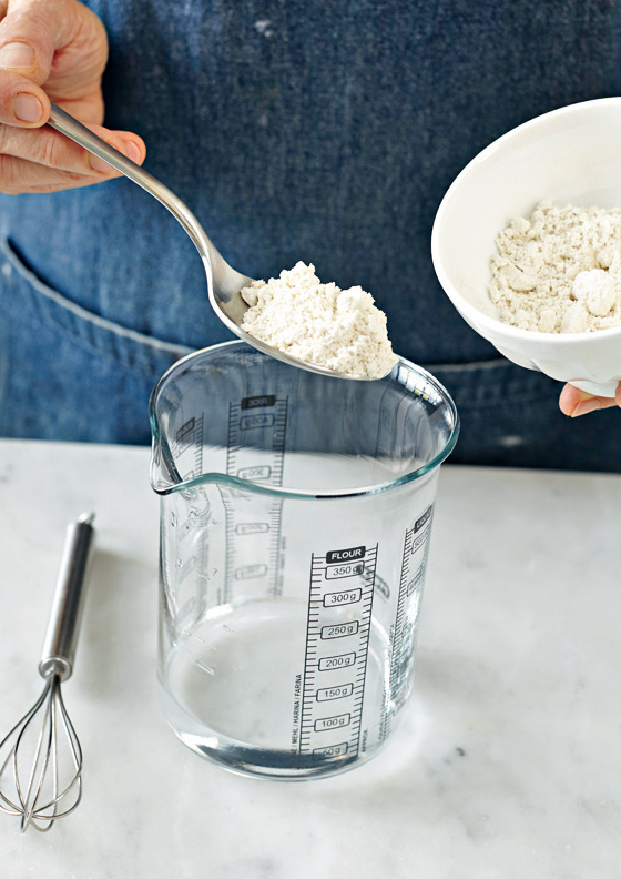 1) Versa la farina di mandorle in un bicchiere graduato.