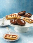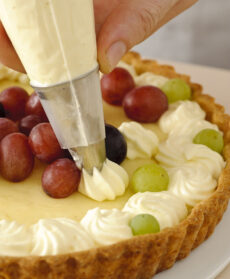 Guarnisci la superficie con acini d’uva e ciuffi di panna montata fatta scendere da una tasca con bocchetta a stella. Puoi sostituire l’uva con frutti di bosco (lamponi, mirtilli, more) o frutta esotica (ananas, mango, papaia) a fettine.
