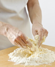 Raccogli sulla spianatoia 300 g di farina bianca, mescolaci un pizzico di sale e fai la fontana; metti al centro lo zucchero semolato, il burro tagliato a pezzetti e amalgamali alla farina con la punta delle dita fino a ottenere delle grosse briciole.