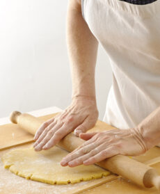 Riprendi la pasta e stendila con il matterello sulla spianatoia infarinata allo spessore di circa mezzo cm.