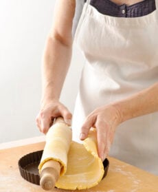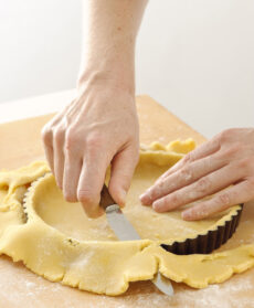 Con le dita fai aderire la frolla ai bordi dello stampo, poi passaci sopra con il matterello ed elimina la pasta eccedente (puoi metterla in frigo avvolta in pellicola e utilizzarla per preparare piccoli decori o biscottini).