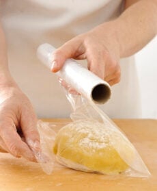 Sguscia al centro l’uovo intero e il tuorlo, sbattili leggermente con una forchetta, amalgama il tutto e lavora velocemente la pasta fino a renderla compatta. Forma una palla, avvolgila in pellicola e lasciala riposare in frigo per mezz'ora.