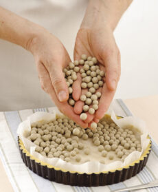 Punzecchia il fondo della pasta con una forchetta, coprila con un foglio di carta da forno e con legumi secchi e inforna a 180° per circa 15-20 minuti; sfornala, elimina legumi e carta e lasciala raffreddare.