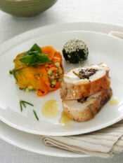 Arrosto di salmone e nasello all’arancia con cavolini alla melagrana