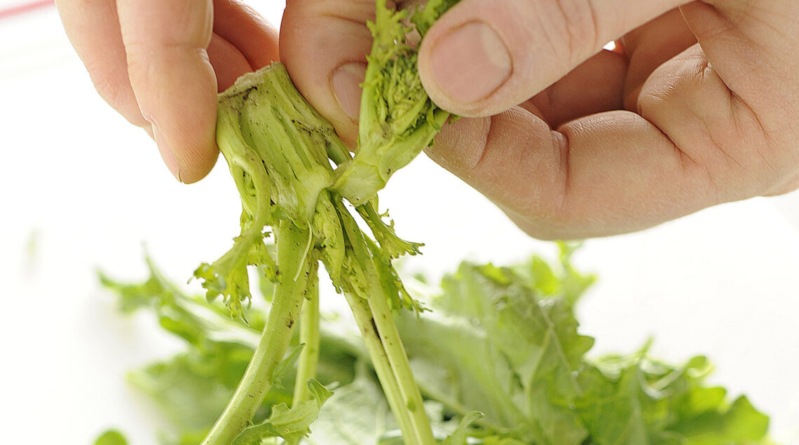 Per prima cosa eliminate le foglie danneggiate e quelle più grandi e dure e la base dei gambi, quindi selezionate le parti morbide delle cime.