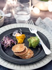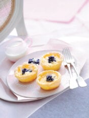 Cominciate la composizione disponendo lungo il bordo dell’alzatina l’uva nera e alcune prugne fissate con gli stuzzicadenti; poi riempite gli spazi vuoti con qualche rametto di more.