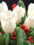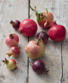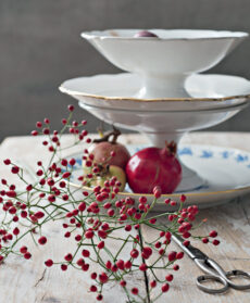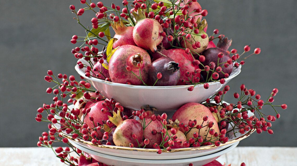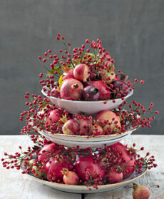 Con un pezzo di carta da cucina inumidito pulisci e lucida le melagrane e distribuiscile sui tre ripiani alternandole a seconda delle sfumature e delle dimensioni. Una volta disposti i frutti, completa la composizione infilando tra un pomo e l’altro i rametti di bacche di rosa canina tagliati con lunghezze e forme diverse. Inseriscili negli spazi liberi in modo da creare un insieme armonioso.