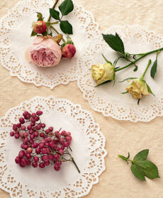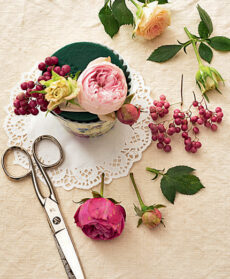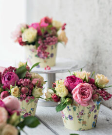 Proseguite alternando le roselline gialle, rosa e fucsia anche in base al loro grado di fioritura: alcune più aperte e altre più chiuse a bocciolo. Inserite tra loro altri rametti di bacche, in modo da creare un’alternanza gradevole di forme e colori.