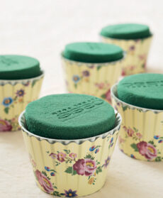 Togliete dai cachepot, che qui fungono da pirottini per cupcake, la fascia di cartone esterna per non bagnarla e, con una brocchetta, versate l’acqua sulle spugne finché ne saranno ben imbevute.