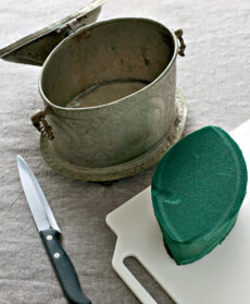 Rifilate la spugna con un coltello per darle la forma ovale del vaso scelto e sistematela all’interno del recipiente.