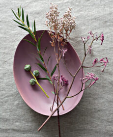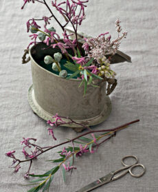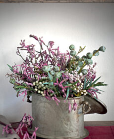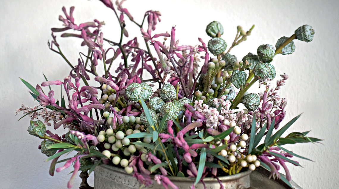 Iniziate posizionando sulla sinistra alcuni fiori di anigozanthus che saranno i più alti di tutta la composizione. A seguire alternate le bacche di eucalipto all’erica e alla berzelia tagliando i rami in modo che risultino un po’ più basse dei fiori di anigozanthus.