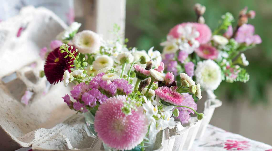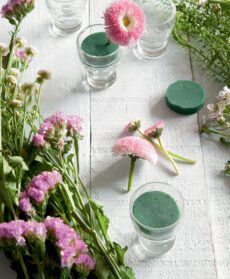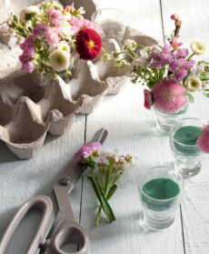 Tagliate i gambi dei fiori ad altezze variabili tra i 5 e gli 8 cm e iniziate la composizione infilando i fiori e i rametti nei bicchierini.