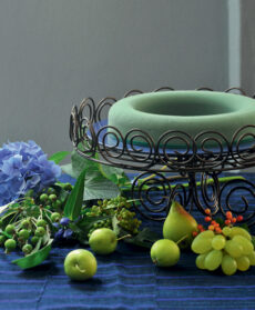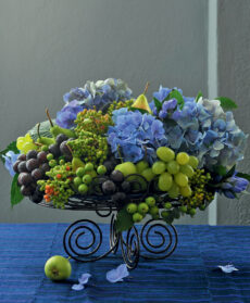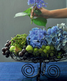 Disponete più a destra un grappolino di uva verde e proseguite inserendo nelle spugne le ortensie a cui avrete accorciato i gambi. Completate la composizione riempiendo gli spazi rimasti vuoti e la base con melette selvatiche, uva e i restanti rami di viburno.