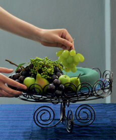 Iniziate disponendo il grappolo di uva nera sulla sinistra, lasciandolo fuoriuscire leggermente dal bordo, e sistemategli accanto alcune meline e perine verdi più 2 o 3 rami di viburno con bacche verdi.