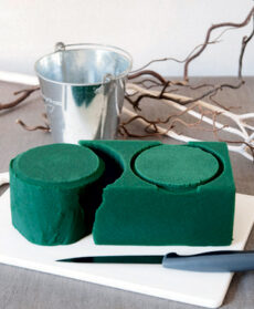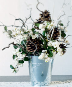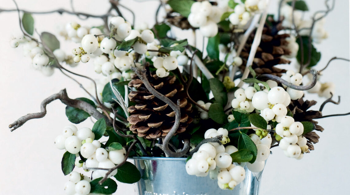Iniziate la composizione infilando nella spugna i rami di nocciolo, di vimini e le pigne, tagliandoli prima con le cesoie per regolare le altezze. Una volta posizionati questi elementi, completate la composizione riempiendo in modo armonioso gli spazi rimasti con i rametti di bacche bianche.
