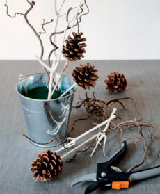 Ricavate dal ramo di nocciolo tanti rami piccoli e fate lo stesso con il vimini. Se le pigne hanno un gambo corto o non ce l’hanno, infilate alla base di ognuna un lungo spiedino di legno e fissatelo con la colla.