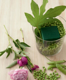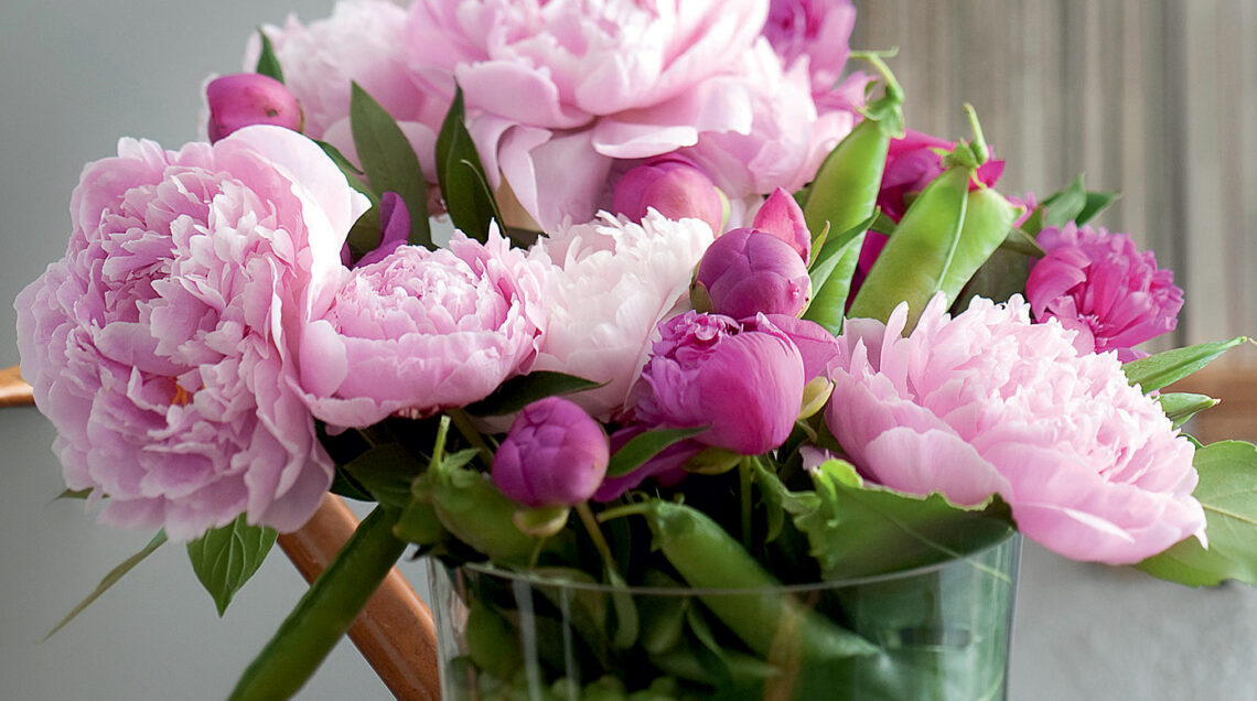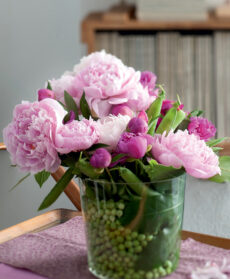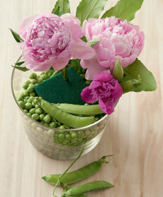 Disponete le peonie nel vaso infilandole nella spugna bagnata e alternando i colori e le dimensioni. Completate la composizione inserendo alcuni dei baccelli tenuti da parte tra le peonie e altri nel vaso sopra i piselli sgranati.