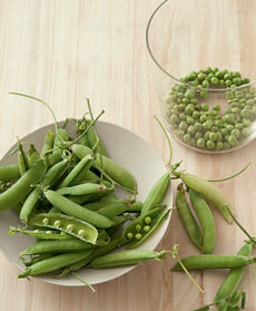 Scegliete i piselli con baccelli più belli e più turgidi e mettetene da parte una manciata; sgranate gli altri e raccoglieteli in una ciotola.