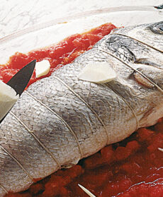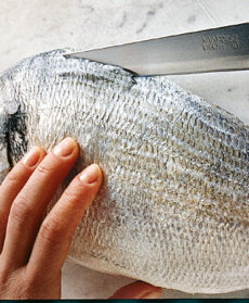 Mettete il pesce (qui abbiamo usato un’orata di circa un kg), prima squamato, privato di pinne e sventrato, sul tagliere e con un coltello appuntito praticate un’incisione partendo dalla testa fino alla coda lungo la spina dorsale.