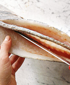 Introducete quindi la lama tra la lisca e il filetto di sinistra, separandoli, poi voltate il pesce e fate la stessa operazione dall’altro lato. A questo punto il pesce dovrà aprirsi quasi a libro.