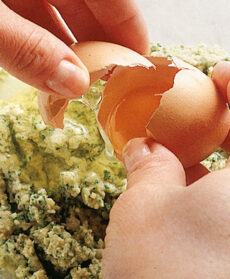 Per il ripieno mettete a bagno, in un quarto di latte, 100 g di mollica di pane, strizzatela bene, sbriciolatela in una terrina e mescolatevi una cipolla tritata e appassita in 30 g di burro, un ciuffo di prezzemolo tritato con un rametto di cerfoglio e un uovo; salate e pepate e amalgamate.