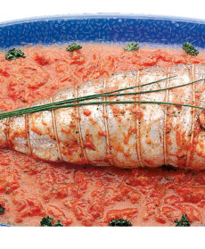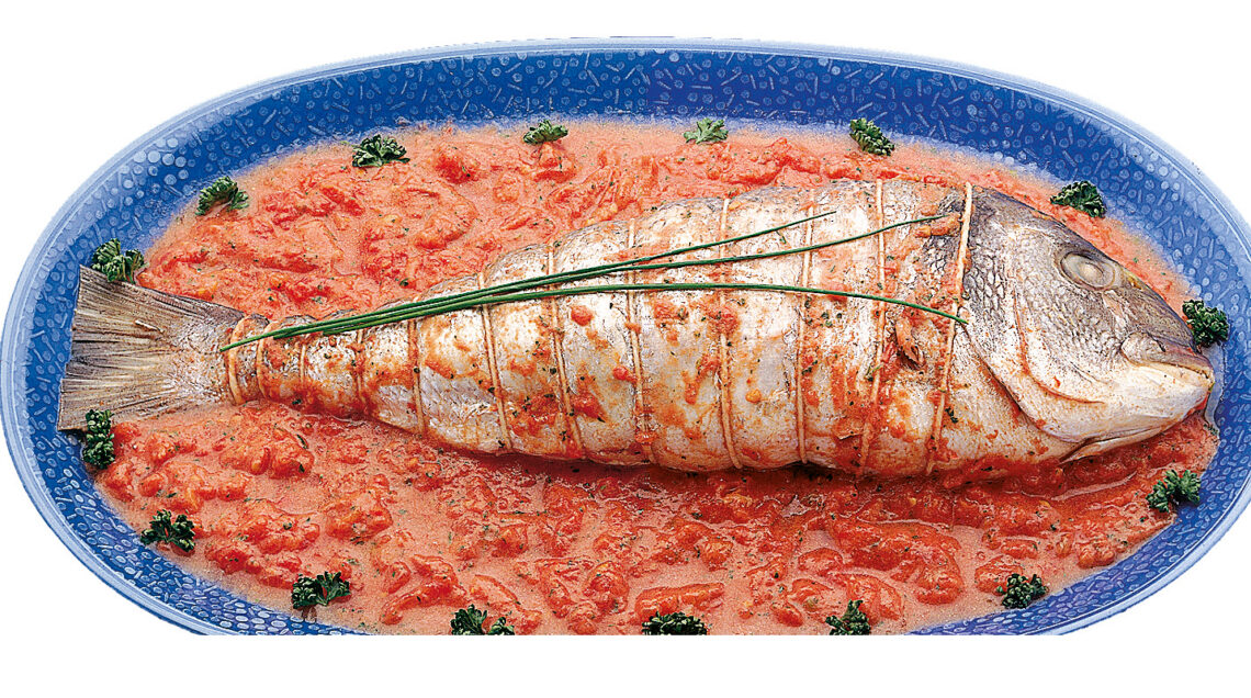 Mettete il pesce in una pirofila, che lo contenga di misura; disponetevi attorno 400 g di pomodori tritati e sopra fiocchetti di burro, un trito di erbe aromatiche miste, 2 cucchiai di panna e mezzo bicchiere di vino.