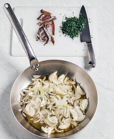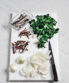 Affettate sottili le cipolle, mettetele in una padella con 1/2 bicchiere d'olio e soffriggetele finché si saranno ammorbidite. Aggiungete le acciughe e fatele sciogliere, mescolando; a fuoco spento, unite il trito di prezzemolo.