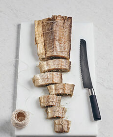 Legate lo stoccafisso in più punti con spago da cucina, senza stringere troppo, e affettatelo con un coltello seghettato; nel tagliare, cercate di mantenere la legatura al centro di ogni fetta.