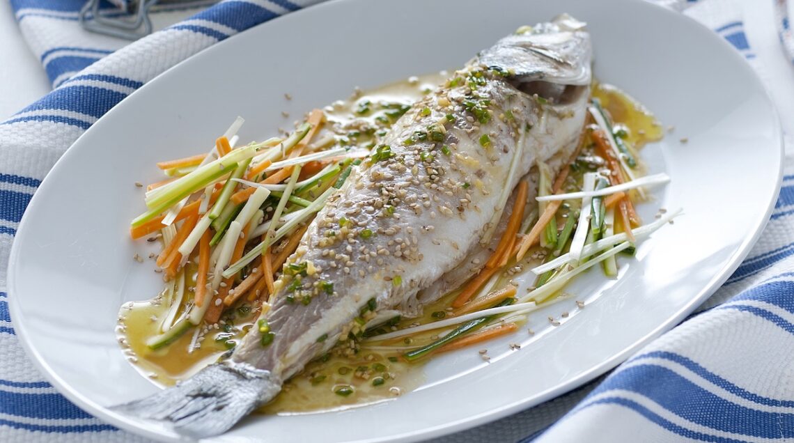 Una alternativa alla padella così come alla bollitura è la cottura del branzino a vapore. Per cucinare il branzino con citronette della foto in alto, squamate 4 branzini da porzione, privateli delle branchie e lavateli, disponeteli nell’apposito cestello in una pentola con acqua in ebollizione e cuoceteli al vapore per circa 10 minuti. Pulite e tagliate intanto a julienne una carota, una zucchina, dei cipollotti e una costa di zenzero, passateli in acqua ghiacciata e serviteli con i branzini fatti intiepidire e spellati, condendo il tutto con una salsina a base di zenzero, olio, succo di limone, erba cipollina tagliuzzata, salsa di soia, un pizzico di zucchero, sale e pepe. Spolverizzate con semi di sesamo e servite.