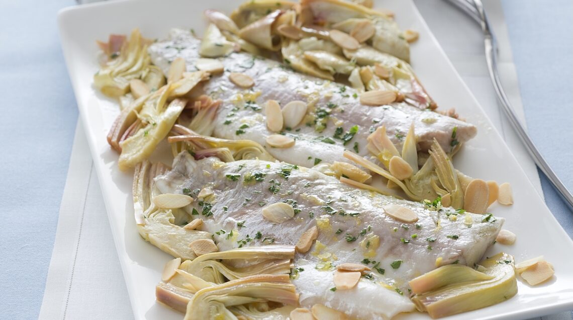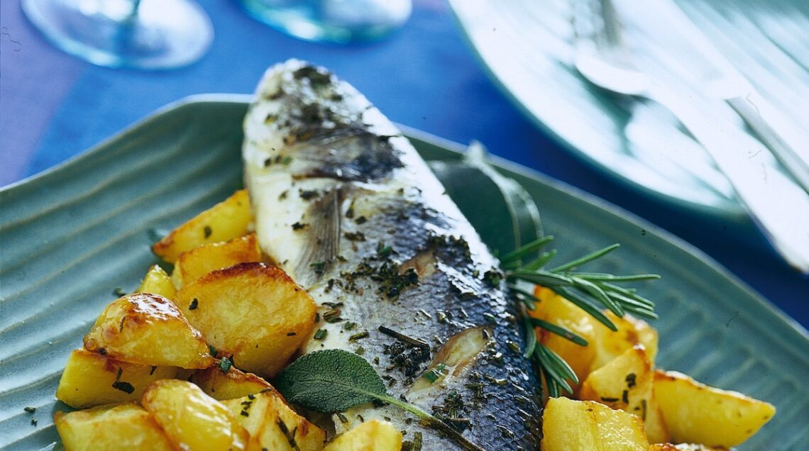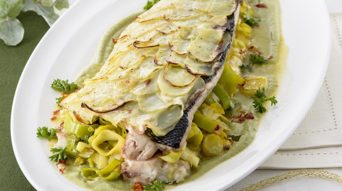 Un’altra ricetta da provare è quella del branzino in crosta di patate (foto sopra). Per prepararlo, pulite il pesce, tagliatelo lungo la lisca, eliminatela e quindi farcitelo con porri allo zafferano cotti in padella. Rivestitelo da sottili fettine di patate e cuocetelo per 20 minuti in forno caldo a 200°, servendolo poi con una vellutata preparata frullando dei carciofi lessati con un goccio della loro acqua di cottura, prezzemolo e besciamella.