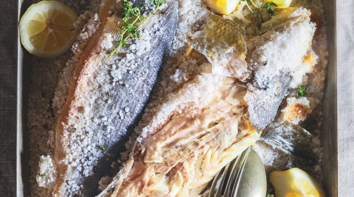 Altre ricette analoghe sono quelle di questo branzino in guscio aromatico, cotto nel sale insaporito da erbe miste, questo branzino in crosta, con il sale mescolato all’albume d’uovo per renderlo modellabile o, ancora, questo branzino al salmoriglio, cotto in crosta di sale spennellata con una pastella di farina e acqua.