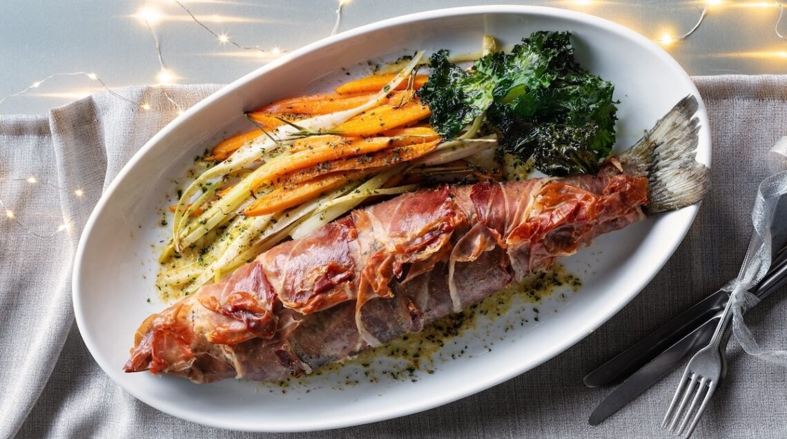 Una variante più complessa è quella del branzino al crudo (foto sopra) con il pesce farcito da cavolo riccio sbollentato, tritato e mescolato con pangrattato tostato e paprica. Avvolto nel prosciutto crudo, il branzino è stato poi infornato con olio, carote, sedano, aglio, sale e vino.