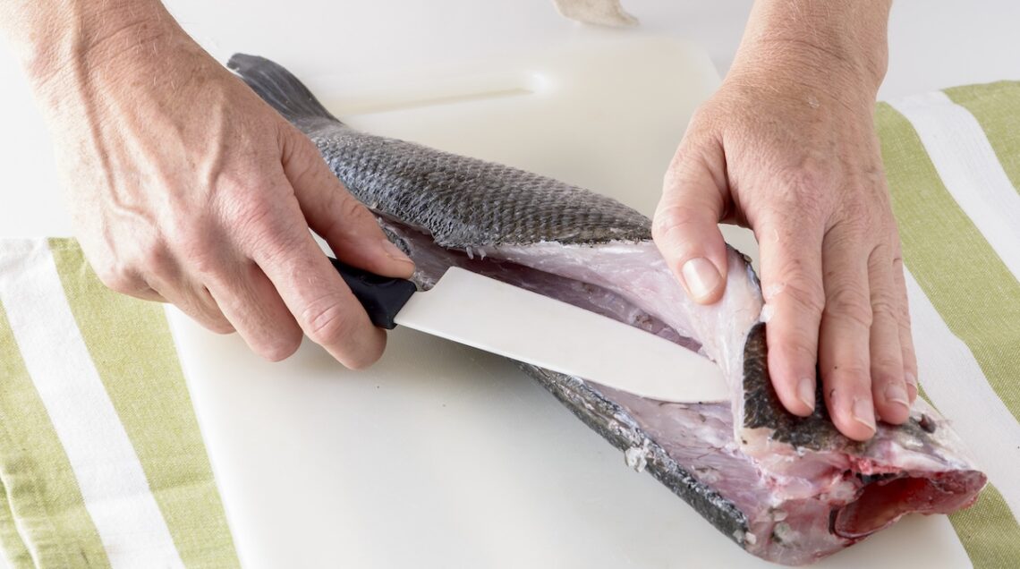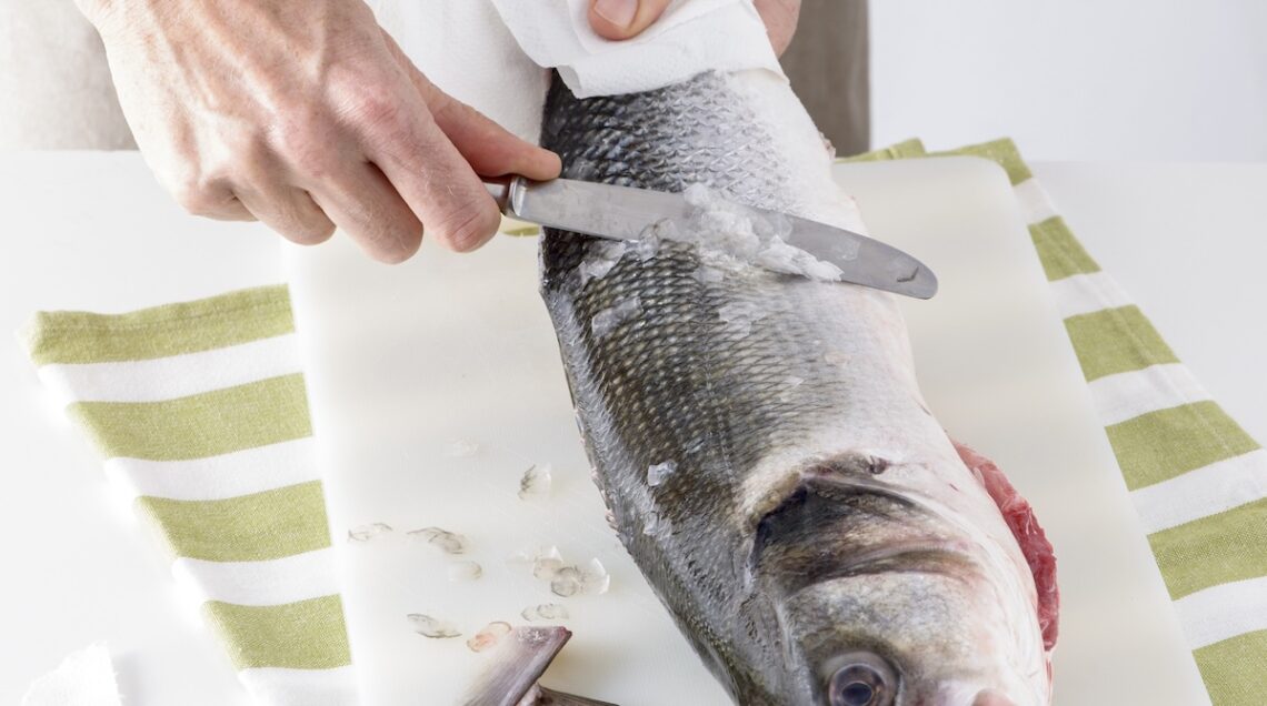 Potete consumare il branzino sia intero sia a filetti. Per usarlo intero pulitelo eliminando branchie, interiora e squame. Per quest’ultima operazione potrete utilizzare un pelapatate o il dorso di un coltello, raschiandovi il pesce dalla coda verso la testa (vedi foto). Ricordate che per cucinarlo al sale o sulla griglia non dovrete squamarlo.