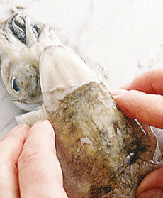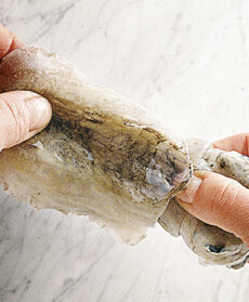 Ora potete spellare la sacca svuotata; sollevate un lembo di pelle nella parte alta della sacca e staccatela con delicatezza dalla carne.