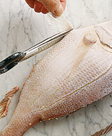 Usate un paio di forbici da cucina per togliere tutte le pinne (caudali, anali, dorsali, pettorali e ventrali). Asportate le dorsali partendo dalla coda verso la testa.Voltate il pesce e asportate la pinna anale, poi le ventrali e quelle pettorali.