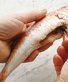Questa operazione va fatta dalla coda verso la testa. Prendete un coltellino da cucina avendo l’avvertenza di usarlo dalla parte della costa e non della lama per non rischiare di tagliare la pelle.