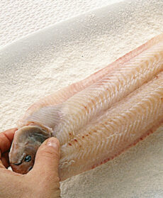 Preparate il pesce per la cottura eliminando le pinne, le squame (se necessario) e le interiora. Qui abbiamo usato delle sogliole di circa 200 g di peso a cui abbiamo tolto anche la pelle. Lavatele e asciugatele con carta assorbente. Poi adagiatele su un piatto e cospargetele con sale e pepe.