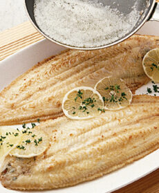 Mettete abbondante farina in un largo piatto o sopra carta assorbente da cucina, e passatevi le sogliole da entrambi i lati scuotendole delicatamente per eliminare l’eccesso di farina.