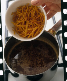 Trasferisci il tutto in un'altra casseruola, con 5 dl di vino bianco e un cucchiaio di concentrato di pomodoro; copri e fai sobbollire per 45 minuti. Poi filtra il brodo ottenuto: servirà per fare la salsa. Fai caramellare 100 g di zucchero, diluiscilo con mezzo bicchiere di aceto, dopo 3-4 minuti unite 2 bicchieri di brodo, cuoci per 10 minuti e unisci la scorza di 2 arance a julienne.