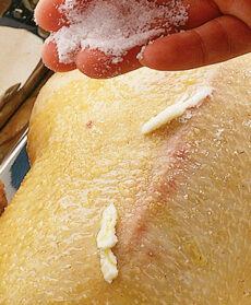 Scegli un’anatra di circa 1,500 kg, sventrala e legala, dopo aver staccato collo e punte delle ali. Mettila in una casseruola con poco olio e burro, salala e cuocila in forno a 220° per 40 minuti.