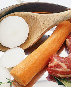 Metti le ali e il collo in una casseruola con una carota, una cipolla a fette, uno spicchio di aglio non sbucciato, un rametto di timo e 2 foglie di alloro. Cuoci in forno a 220° per 15 minuti.