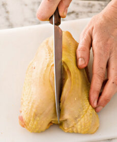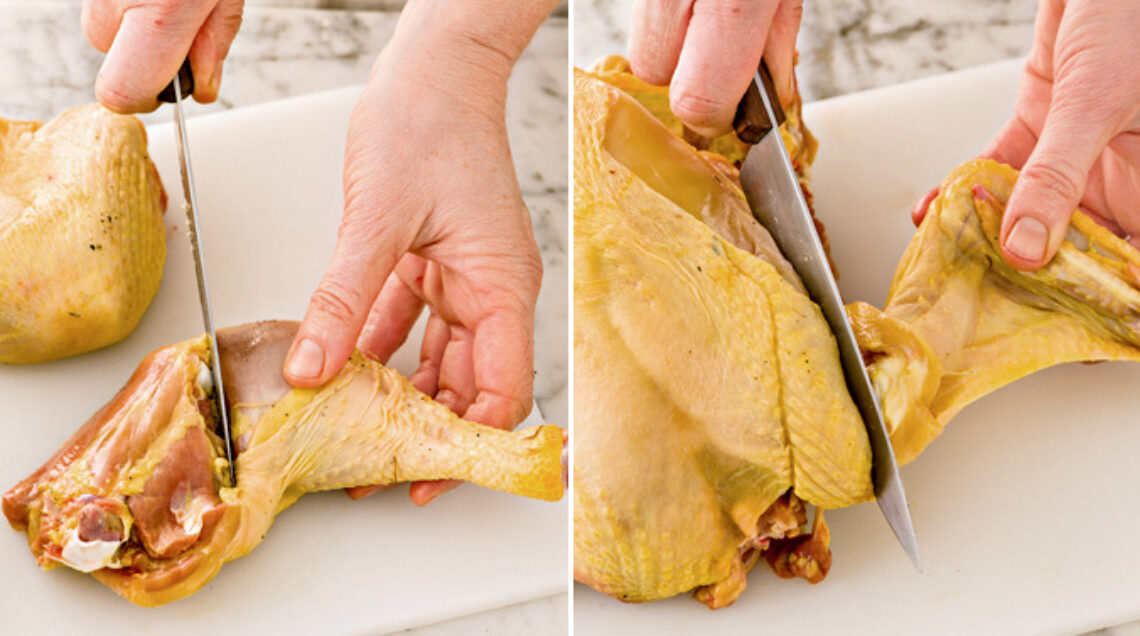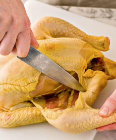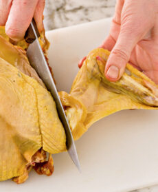 Asportare le ali. Incidi l’articolazione con la carcassa tenendo il coltello obliquo per includere anche una piccola parte del petto.