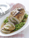 L’abbinamento delle fave con la carne avviene sia in forma di ripieno sia di contorno. E, anche in questo caso, sia con i legumi interi sia con quelli ridotti in purea. L’arrosto arrotolato della foto accosta le fave alla salsiccia e al provolone nel ripieno della lonza, nella cima alla robiola le unisce ai piselli nella farcia del vitello, mentre nell’arrosto di tacchino in crosta i semi verdi incontrano la cicoria e la scamorza.