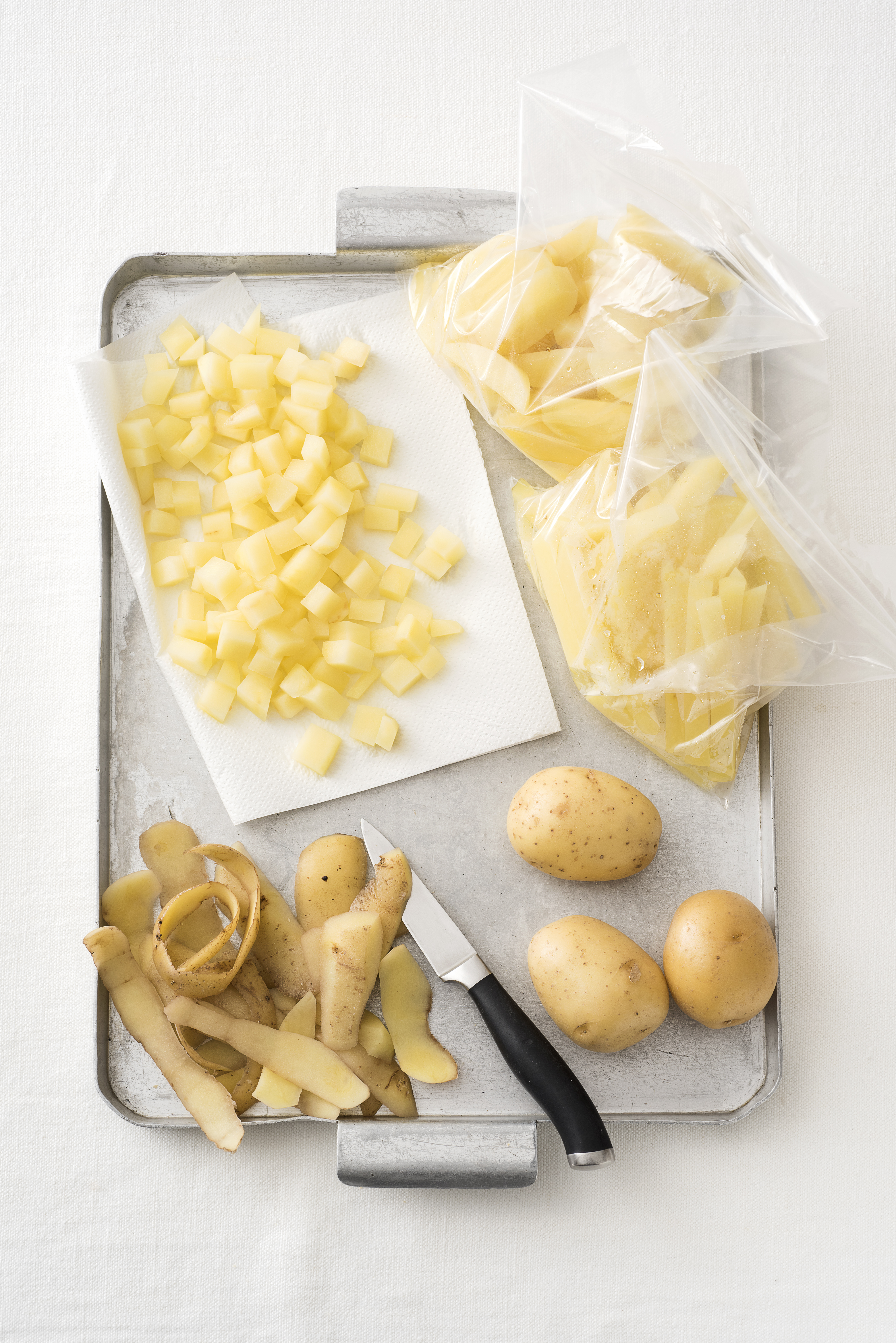 Lava le patate sotto acqua corrente per eliminare bene il terriccio poi sbucciale con il pelapatate e non il coltello che scarterebbe una parte eccessiva di buccia. Non pelarle con troppo anticipo: tendono a perdere consistenza e a diventare nere.