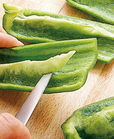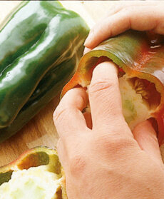 Per eliminarla facilmente, passate il peperone sotto l’acqua corrente, strofinandolo delicatamente con le dita. Oppure, chiudetelo per qualche minuto in un sacchetto di carta: il vapore farà sollevare la pellicina che si staccherà quasi da sola.