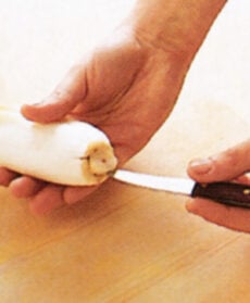 Come prima operazione introducete un coltellino alla base facendolo penetrare per circa 3 cm e, facendolo girare con un movimento circolare, togliete il torsolo centrale.