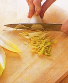 Sfogliate quindi il cespo eliminando le prime foglie esterne con venature marroncine, lavate accuratamente le altre sotto l’acqua corrente, sgrondatele senza sciuparle, sovrapponetene alcune sul tagliere e tagliatele a striscioline.