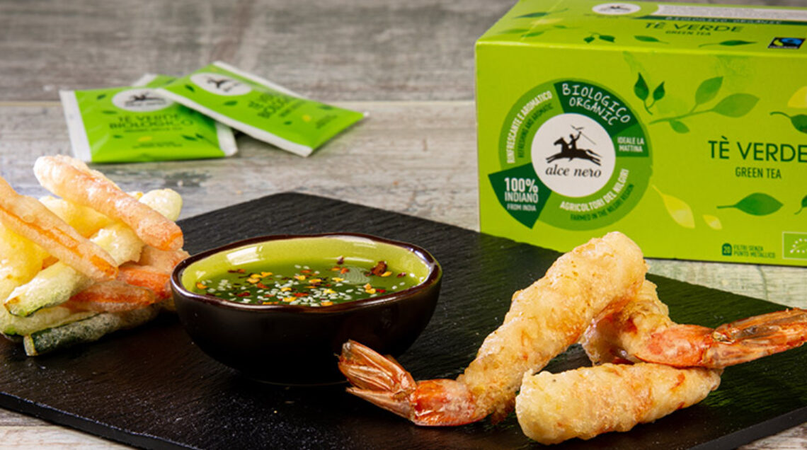 La ricetta della tempura di gamberi e verdure al tè verde vi sorprenderà di sicuro. In effetti non spesso vi sarà capitato di assaggiare una panatura al tè, certamente si tratta di un abbinamento inconsueto, ma talmente buono che diventerà un vostro cavallo di battaglia quando vorrete stupire i vostri ospiti. La nota pungente del tè verde bio, che ricordiamo fa parte della linea Fairtrade, ovvero che ha una certificazione dell’eticità del prodotto, si sposa perfettamente con la dolcezza dello zucchero di canna, anch’esso bio e FairTrade, e con i gamberi stessi, dando vita a un mix di sapori molto interessante.