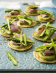Scottate gli asparagi per 2 minuti in acqua salata, scolateli e teneteli da parte. Lavate i ravanelli, dividetene alcuni a metà, lasciate i più piccoli interi e tagliatene altri a fettine sottili. Trasferiteli in una ciotola, copriteli di acqua e metteteli in frigo.